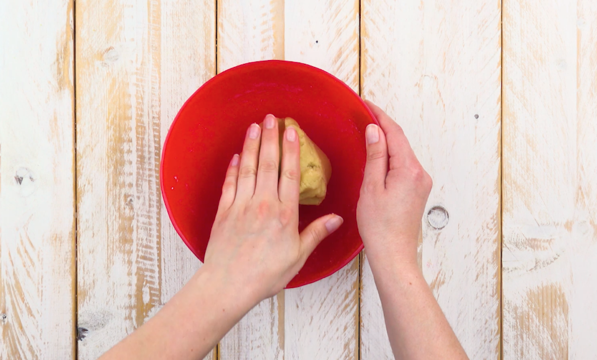 3.) Um dein eigenes Marzipan herzustellen, verknete Puderzucker, Mandeln und Amaretto bis du eine feste, zusammenhängende und nur leicht klebrige Masse erhältst. Dies erfordert etwas Kraft und Zeit. Krümelt die Masse dabei zu sehr, füge in sehr kleinen Schüben weiteren Amaretto hinzu. Vorsicht: Die Masse wird schnell zu klebrig.