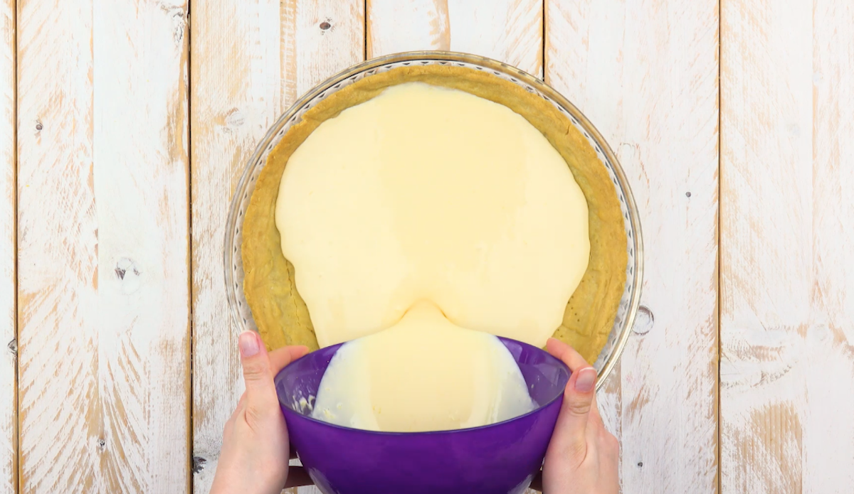 2.) Als nächstes rühre Schmand, Eier, Eigelb, Zucker, Zitronenabrieb und Amaretto mit einem Schneebesen glatt. Erst ganz zum Schluss rührst du das Puddingpulver unter. Dann gießt du die Masse in den Mürbeteig.