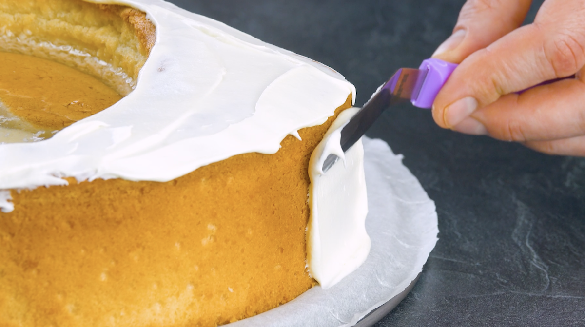8. Bestreiche den Kuchen rundherum mit der Buttercreme und kühle ihn nochmals 30 Minuten.