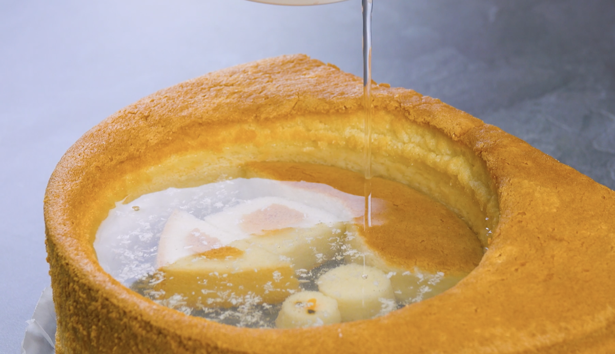 Tipp: Bevor du das Gelee in den Kuchen einfüllst, sollte dieser gut durchgekühlt sein. Am besten eignet sich hier eine Steinplatte, auf der der Kuchen platziert wird, um das Gelee einzugießen, da die Platte lange kalt bleibt und so das Gelee in der ersten Schicht schneller anzieht.