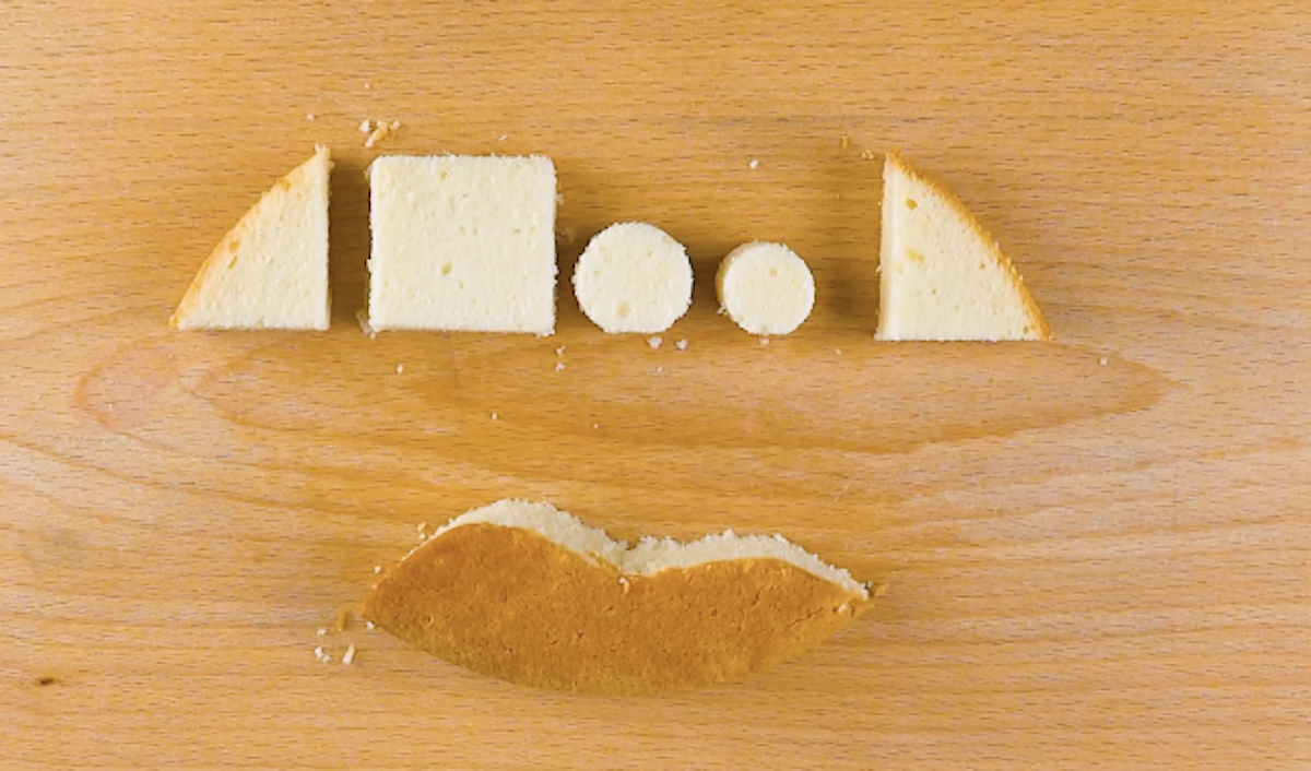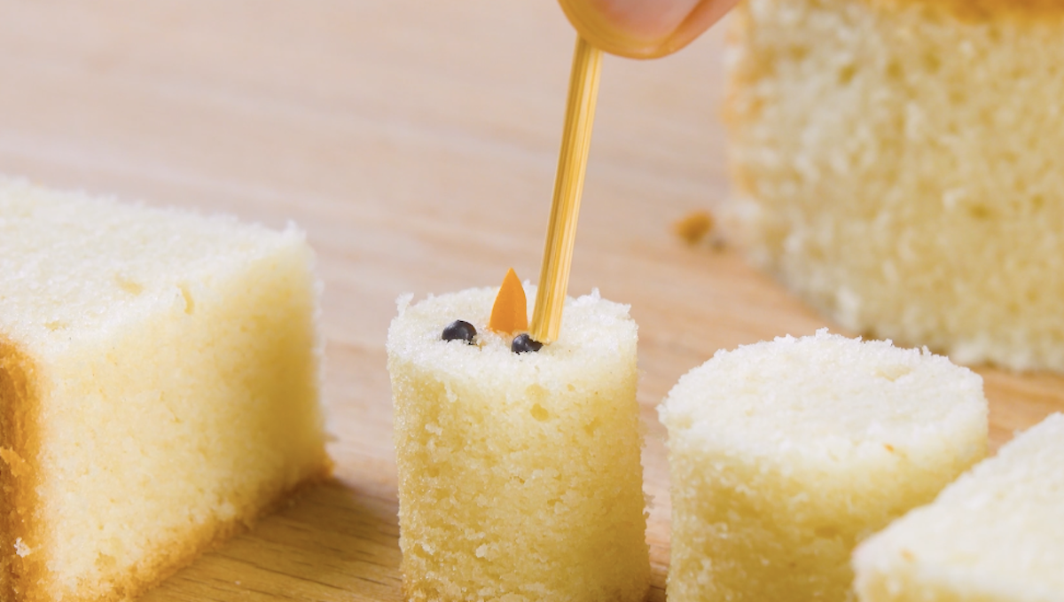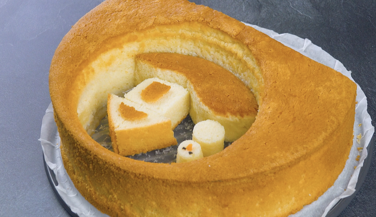 4. Schneide den unteren Teil des Kuchens ab und „baue“ daraus Hügel, Haus mit Dach und Fenster sowie Schneemann.