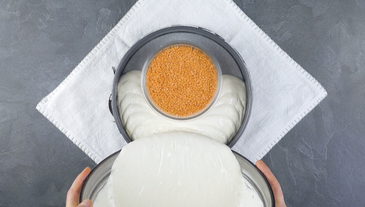 1. Schlage die Eiweiße an, gib nach und nach Zucker hinzu und schlage alles zu einem festen Baiser auf. Arbeite abwechselnd Milch, Pflanzenöl und Mehl unter das Baiser. Fülle Backlinsen in die kleine runde Schale und platziere diese im oberen Teil der mit Backpapier ausgelegten Springform. Fülle dann den Teig in den Bereich außerhalb des Schälchens und backe alles bei 170 °C Ober- und Unterhitze für 90 Minuten im vorgeheizten Ofen. Lass den Kuchen nach dem Backen vollständig abkühlen (ca. 2 Stunden) und entferne dann erst die Schale mit den Backlinsen und den Ring der Springform.