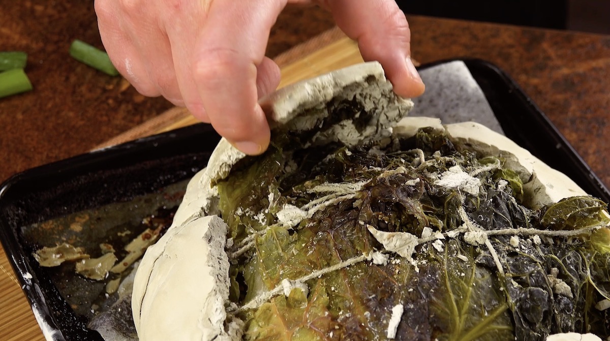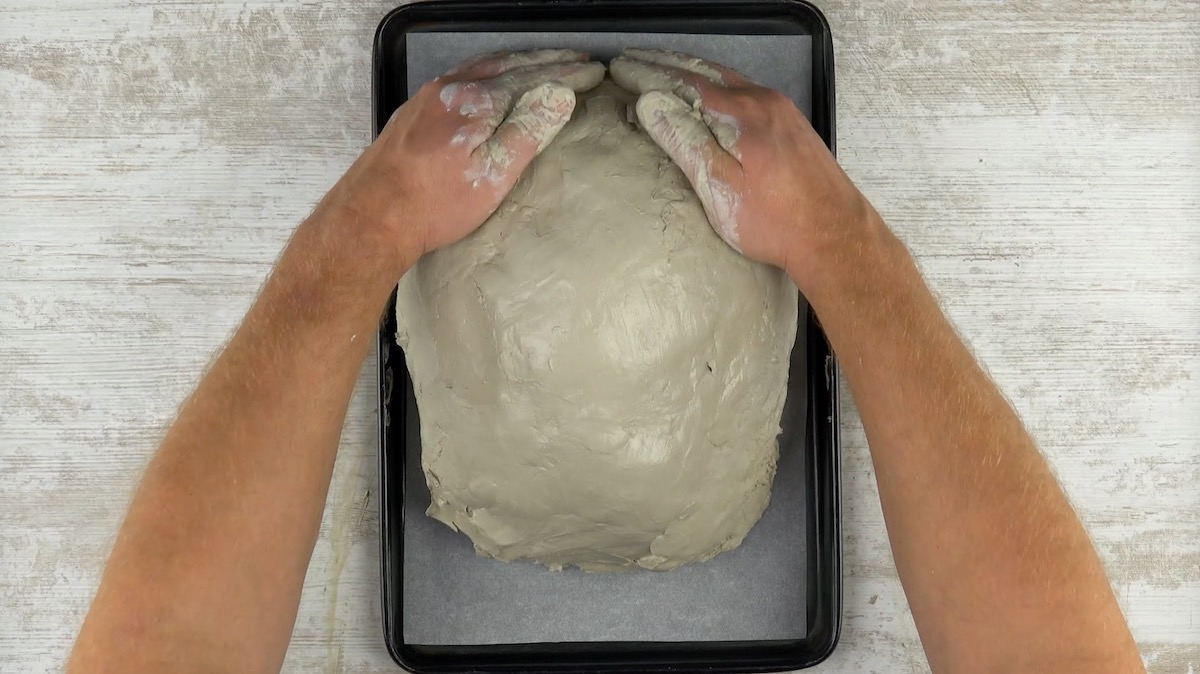 7.) Bedecke das eingewickelte Hähnchen nun mit Ton.