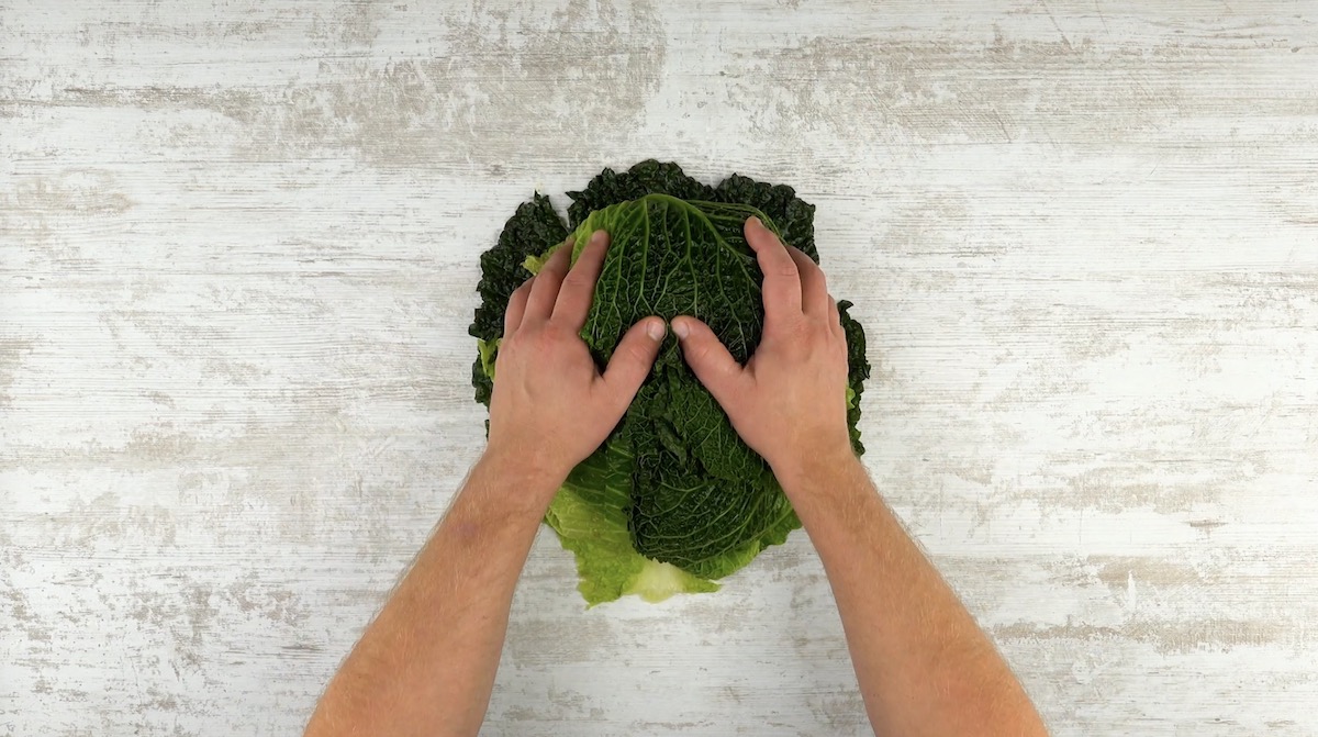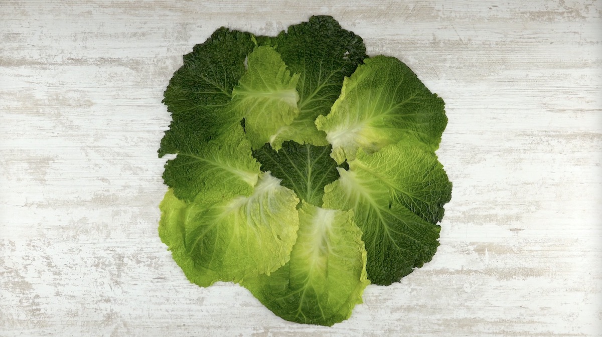 2.) Löse die Blätter vom Wirsing und koche sie kurz in Wasser, bis sie etwas weich sind. Lege dann ein Wirsingblatt auf die Arbeitsfläche und bedecke es kreisförmig mit weiteren Blättern.