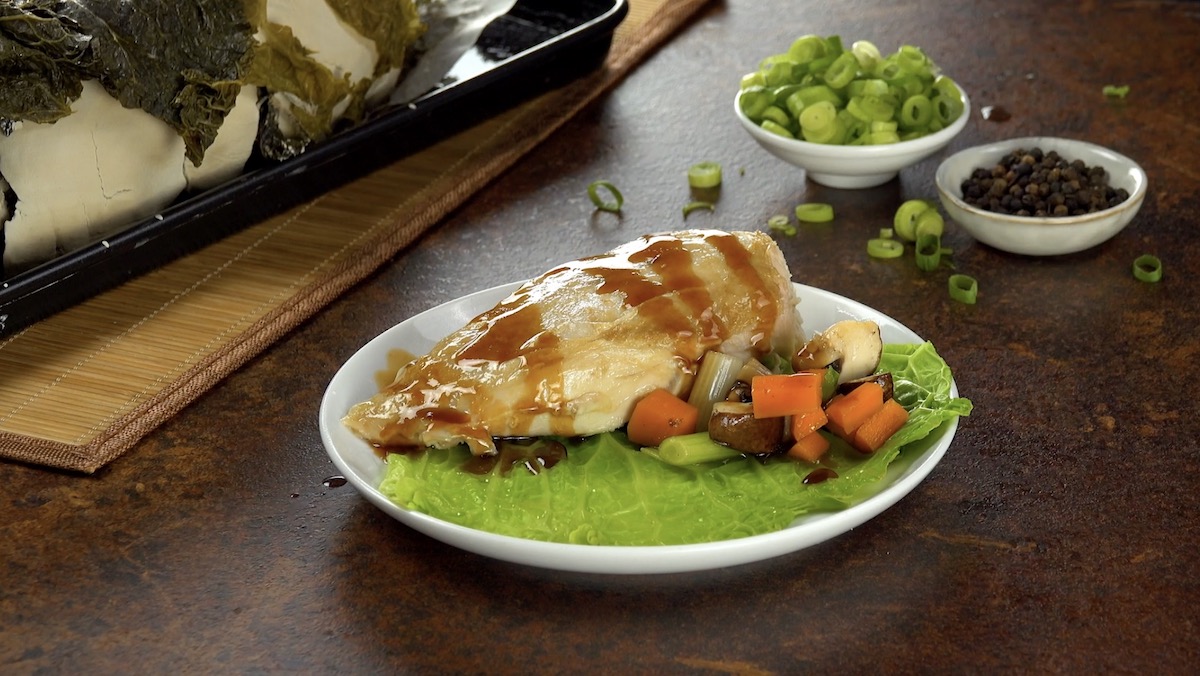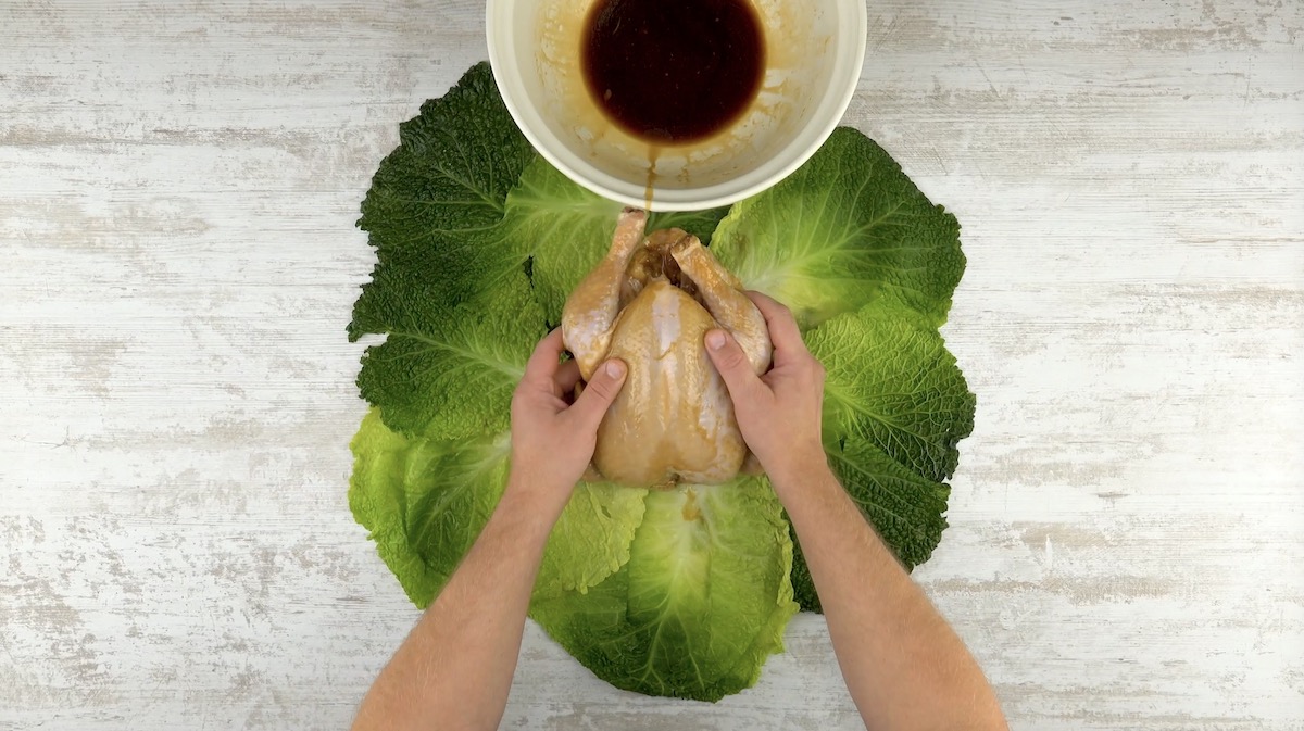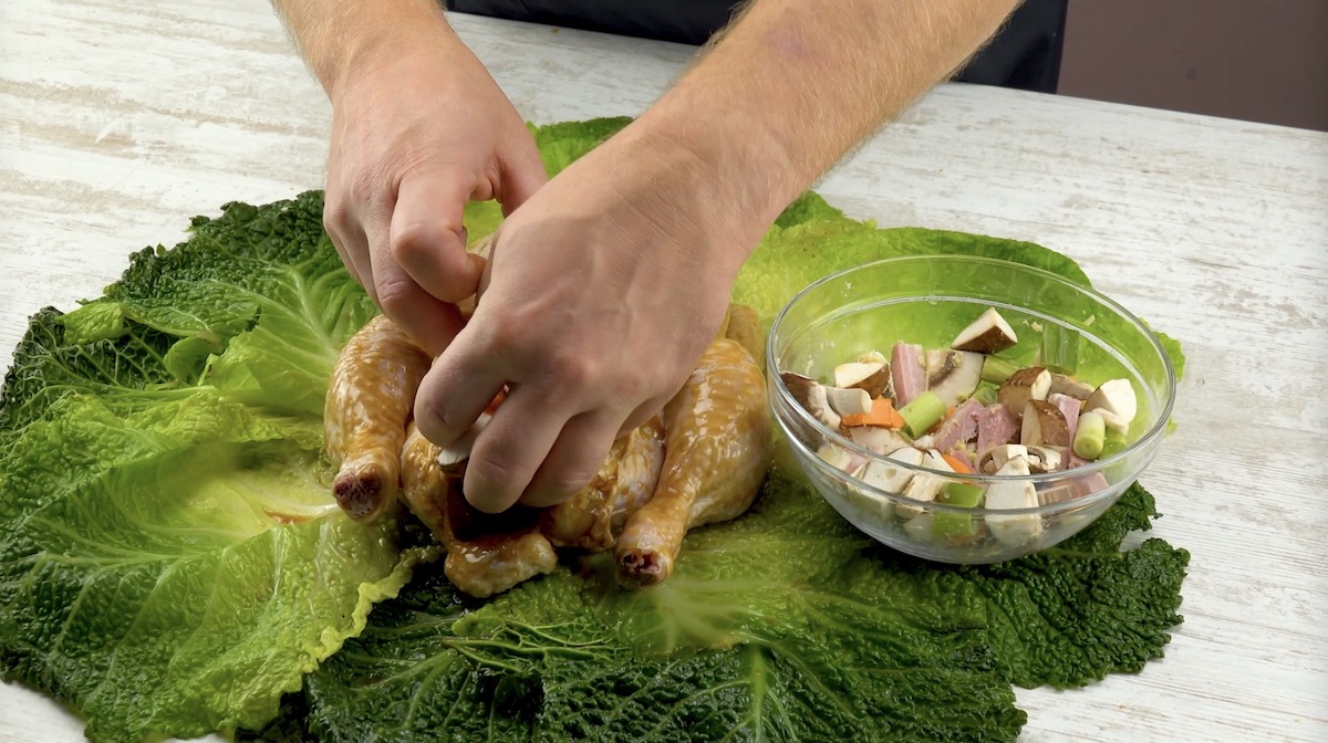 3.) Lege das marinierte Hähnchen in die Mitte des Wirsingkreises.