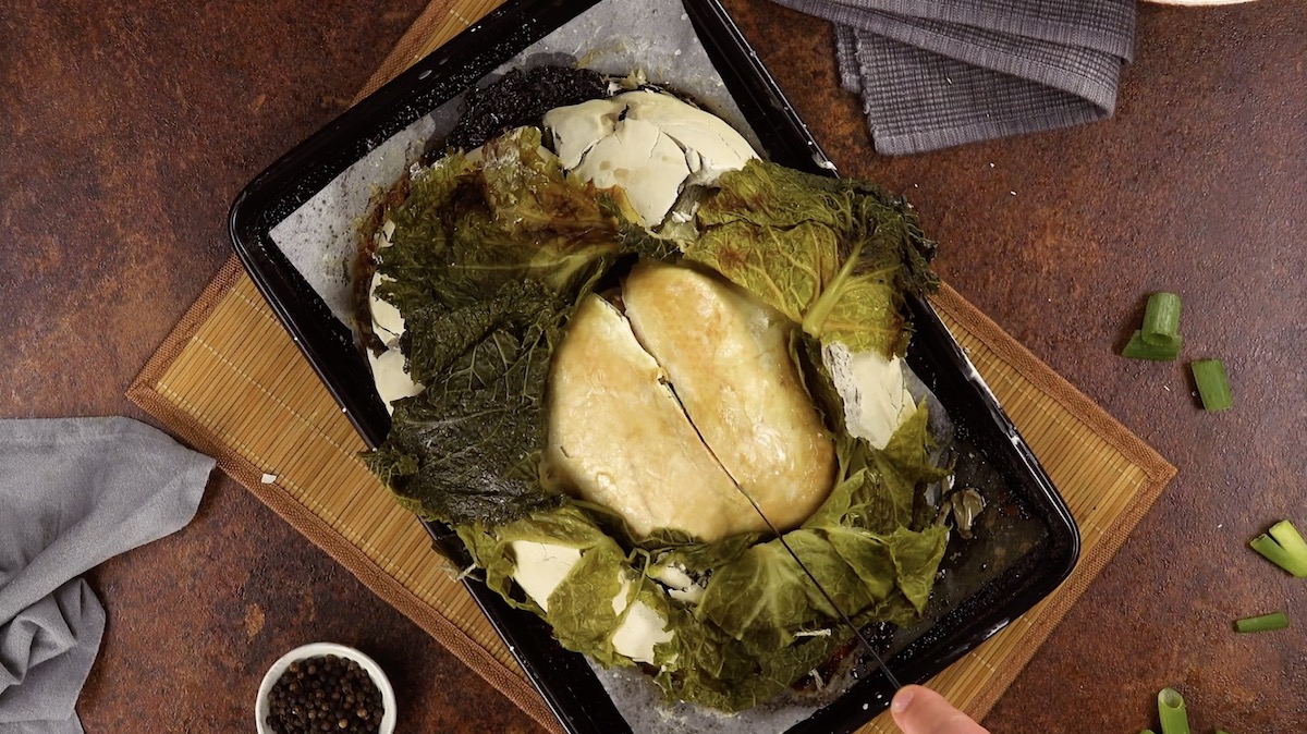 10.) Schneide das Küchengarn auf, löse die Wirsingblätter vom Hähnchen und schneide …