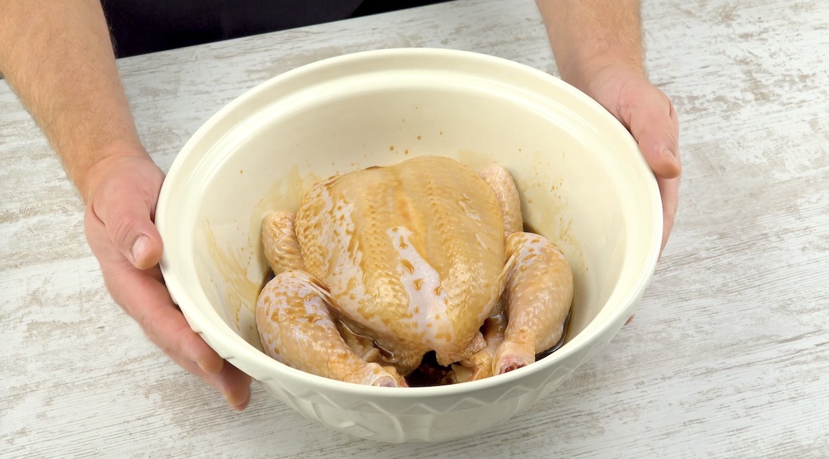 1.) Lege das Hähnchen für 3 Stunden in Salzwasser ein. Vermenge dann die Zutaten für die Marinade und reibe das Hähnchen gleichmäßig innen und außen damit ein. Lass das Hähnchen dann 3 Stunden in der Marinade ziehen.