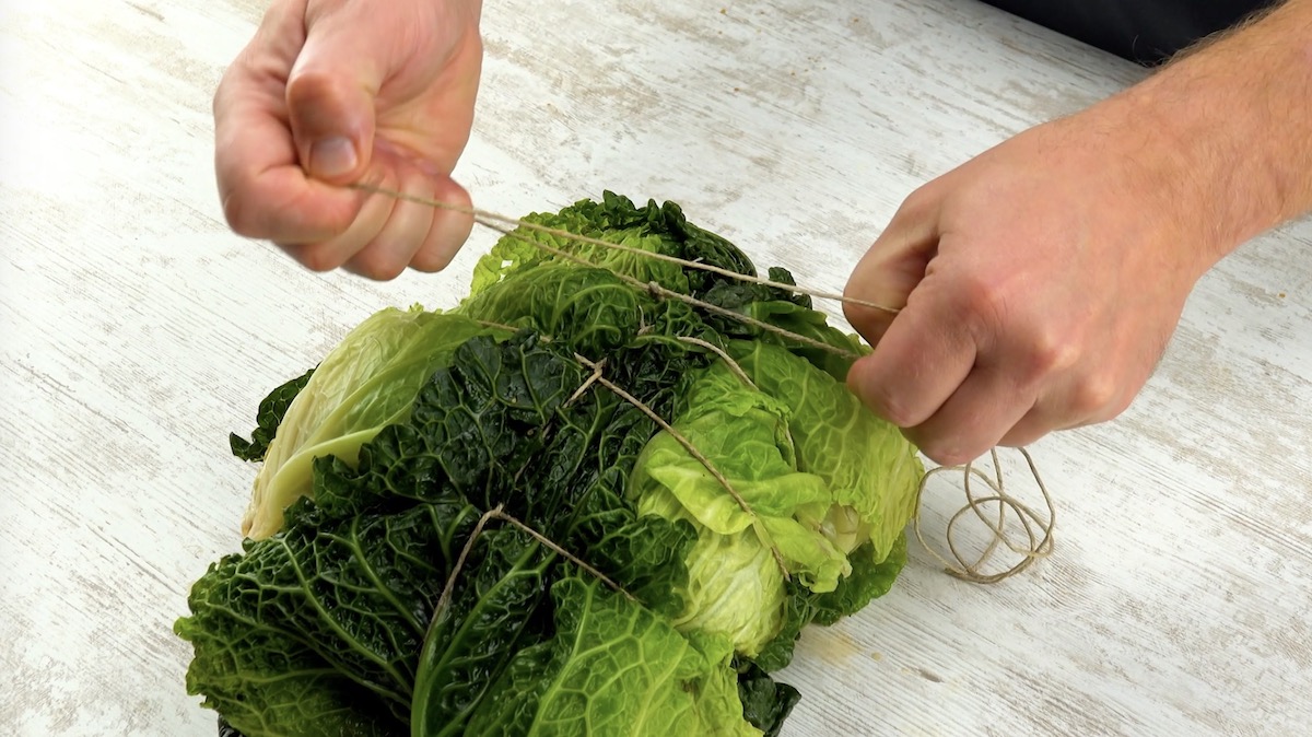 6.) Fixiere die Wirsingblätter mit Küchengarn.
