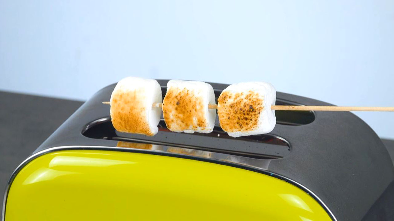 11. Nun brauchst du nur noch die Marshmallows auf einen Holzspieß aufzuspießen und über dem Toaster zu rösten, bis sie leicht braun sind.