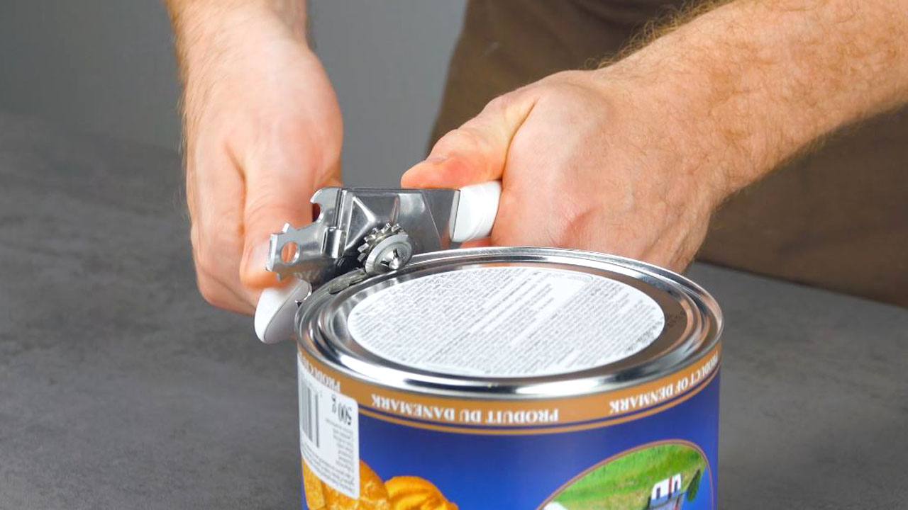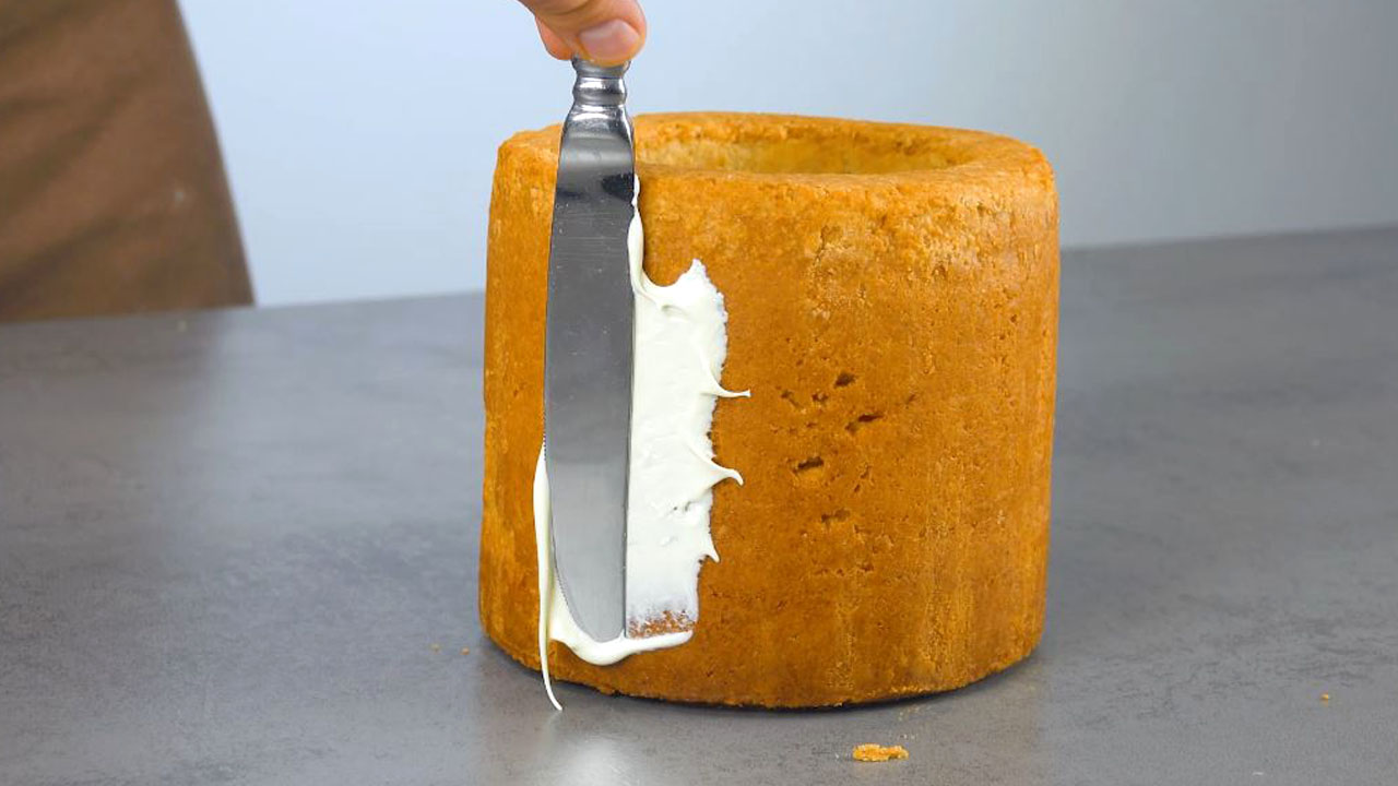6. Wenn der Teig abgekühlt ist, stelle die Dose auf den Kopf und öffne sie mithilfe eines Dosenöffners. Nimm dann den Boden ab und löse den Kuchen aus der Blechdose heraus.