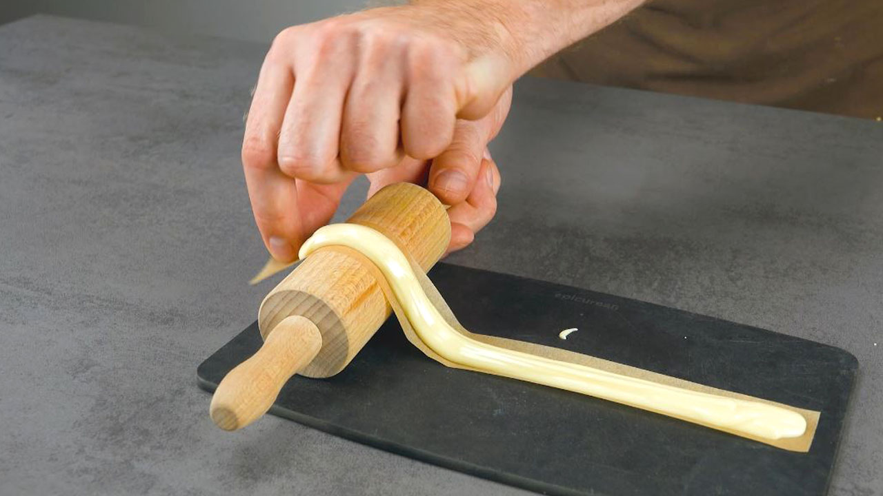 8. Temperiere nun die weiße Schokolade für den Henkel, fülle sie anschließend in einen Spritzbeutel und trage sie auf einen dünnen Streifen Backpapier auf. Lass die Schokolade etwas anziehen und lege sie dann so über ein Nudelholz, dass sie die Form eines Henkels bekommt.