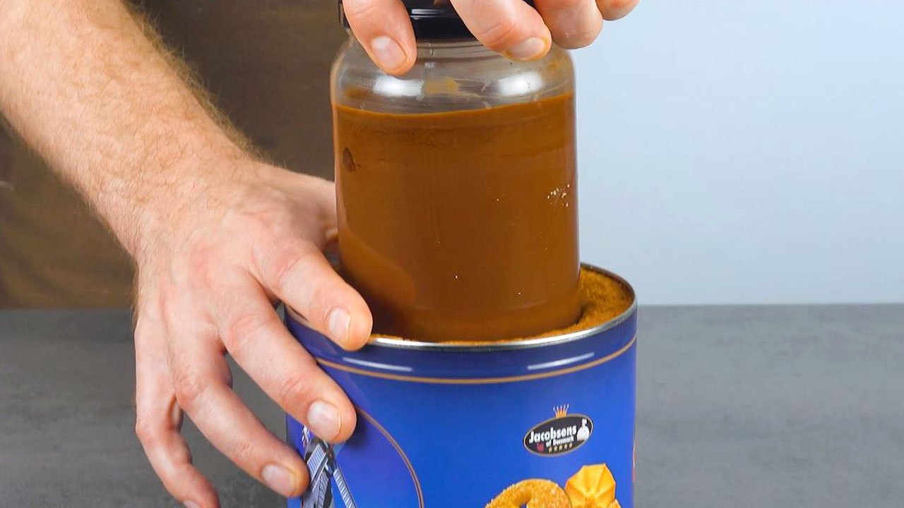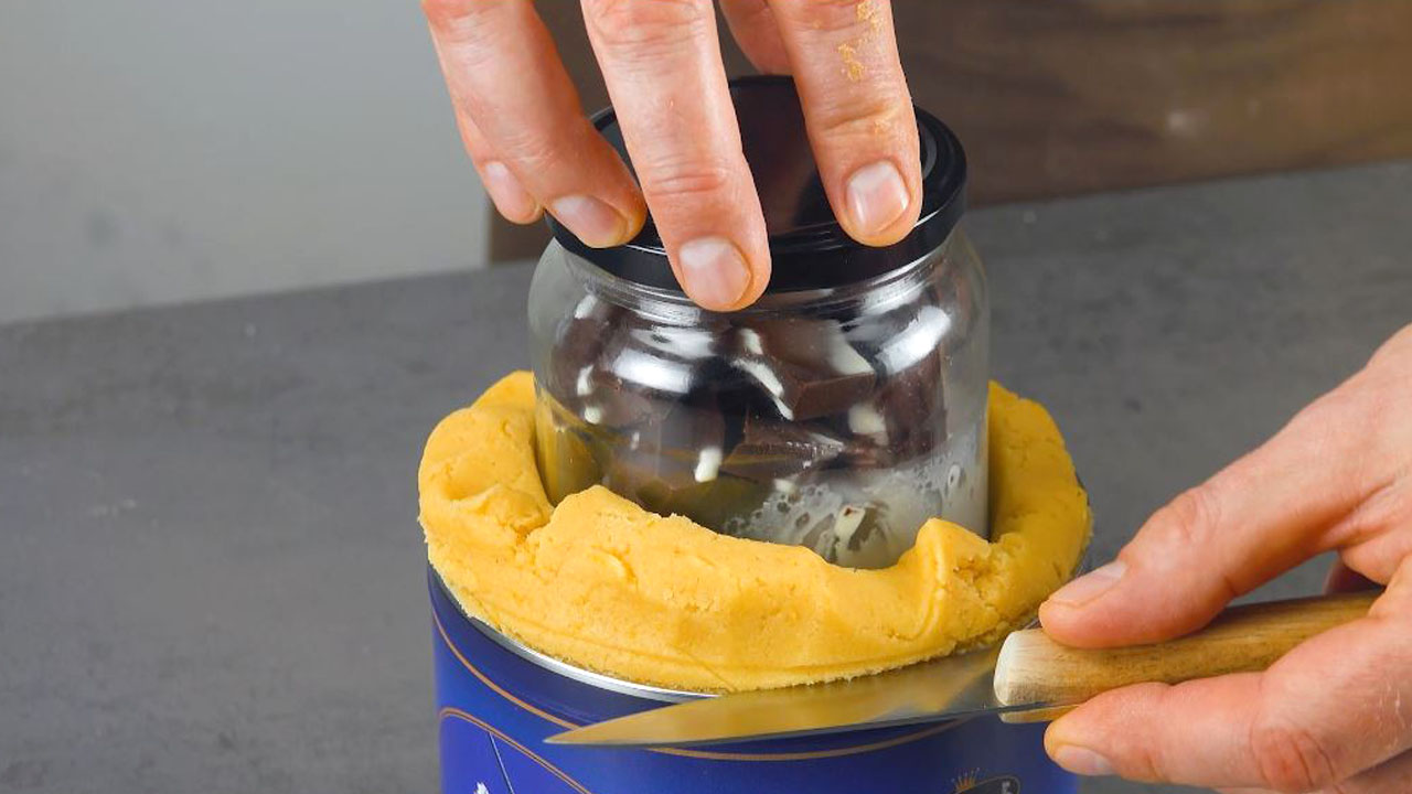 2. Fülle das Glas mit der gehackten Zartbitterschokolade und der Sahne, schraube den Deckel zu und drücke es fest in den Teig, bis dieser bis über den Rand der Blechdose nach oben gequollen ist. Stelle beides zusammen danach für etwa 1 Stunde kalt.