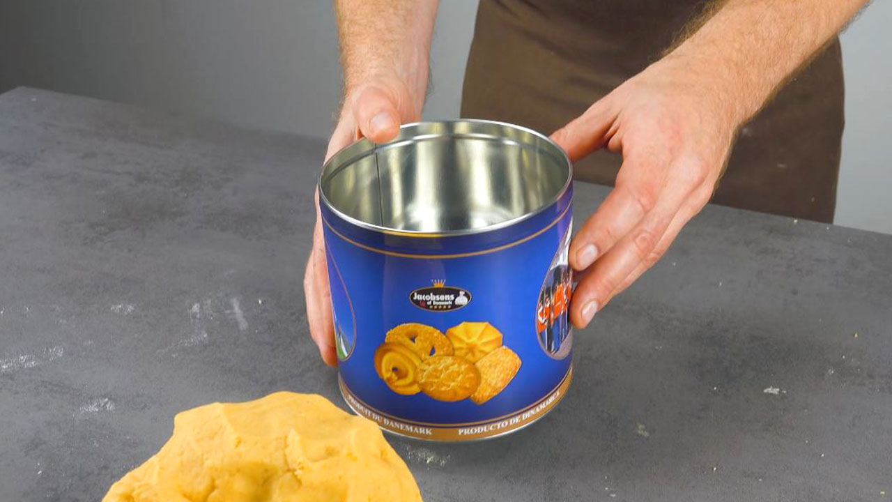 3. Schneide nach dem Kühlen den überschüssigen Teig ab, sodass er mit dem Rand der Blechdose abschließt.