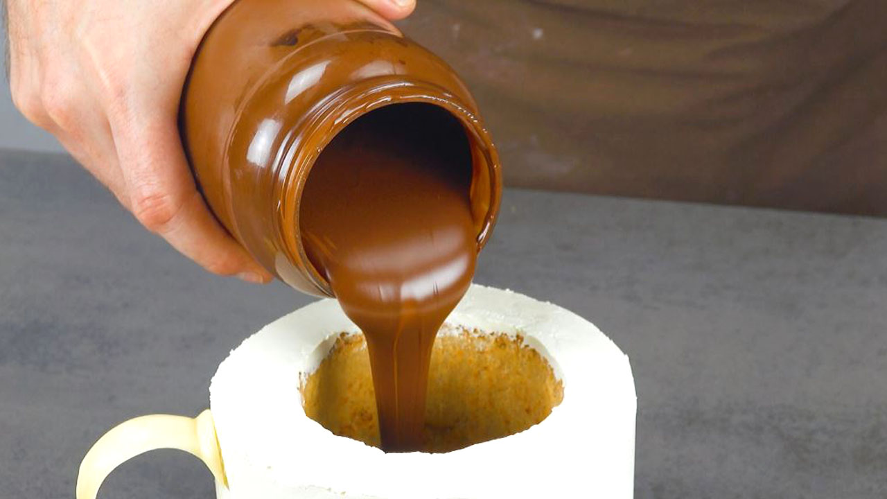 10. Nimm dir abschließend das Glas mit der Schokoladenfüllung und gieße diese vorsichtig in den Hohlraum des Kuchens.