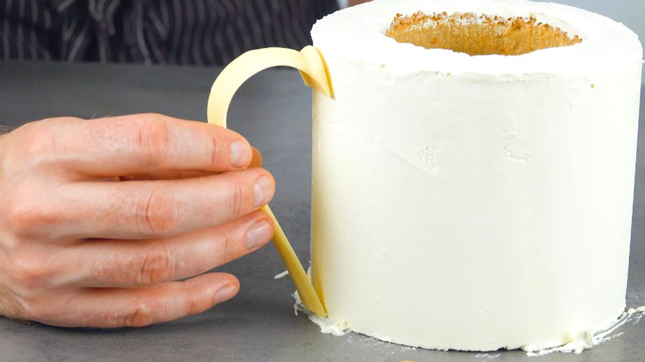 9. Stelle den Henkel samt Nudelholz kalt und löse ihn nach dem Aushärten behutsam vom Backpapier. Bringe ihn anschließend am Kuchen an und stelle beides erneut für ungefähr eine halbe Stunde in den Kühlschrank.