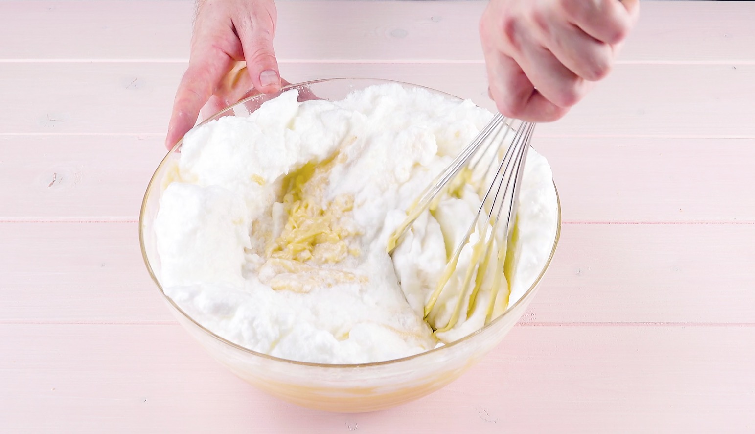 1.) Verrühre die Eigelbe, den Zucker, das Vanillearoma und das Wasser mit einem Handrührgerät in einer großen Schüssel. Rühre anschließend das Pflanzenöl ein und arbeite dann das Backpulver und das Mehl mit einem Schneebesen ein. Hebe zum Schluss das Eiweiß unter und rühre so lange, bis ein glatter Teig entstanden ist.