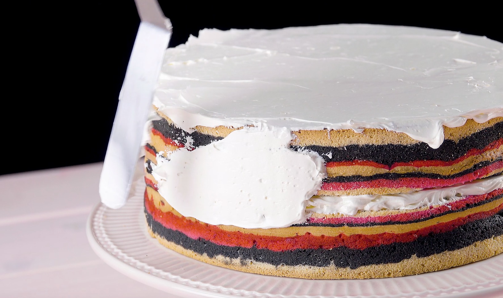 5.) Setze die erste Scheibe anschließend auf eine Kuchenplatte und bestreiche sie gleichmäßig mit weißer Buttercreme. Setze nun die zweite Teigscheibe umgedreht darauf. Nun wird die Torte ganz mit Buttercreme ummantelt und kaltgestellt.