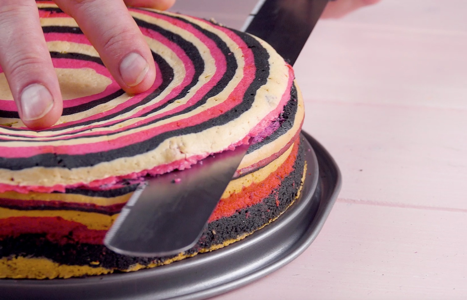 4.) Backe beide Kuchen für 60 Minuten bei 160 °C im Umluft-Modus und lass sie dann auskühlen. Löse beide Kuchen aus der Form und schneide jeweils die Oberseite ab, sodass du eine ganz ebene Fläche erhältst.