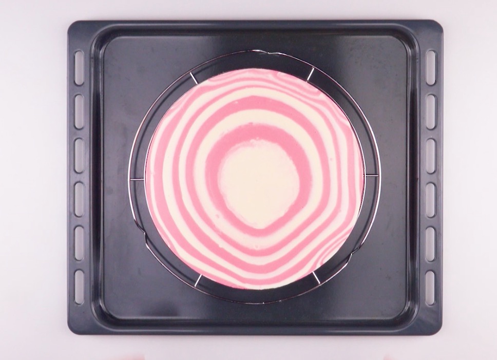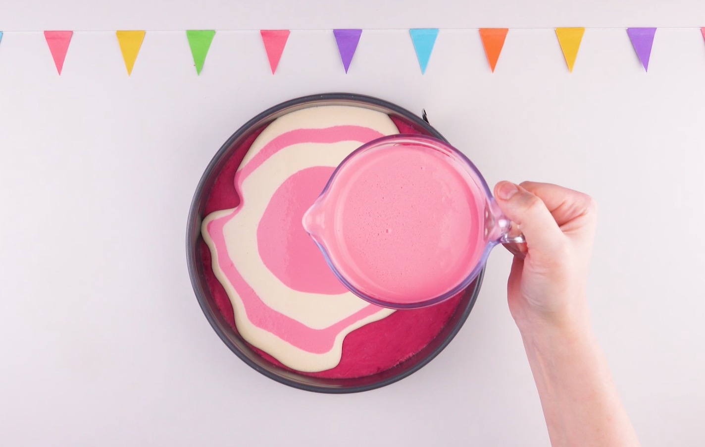 Nun fülle folgendermaßen die Creme in die Springform: Im Wechsel lässt du immer wieder kleine Portionen genau in die Mitte der Form laufen. Durch vielfaches Wiederholen entsteht so das schöne Kuchenmuster.