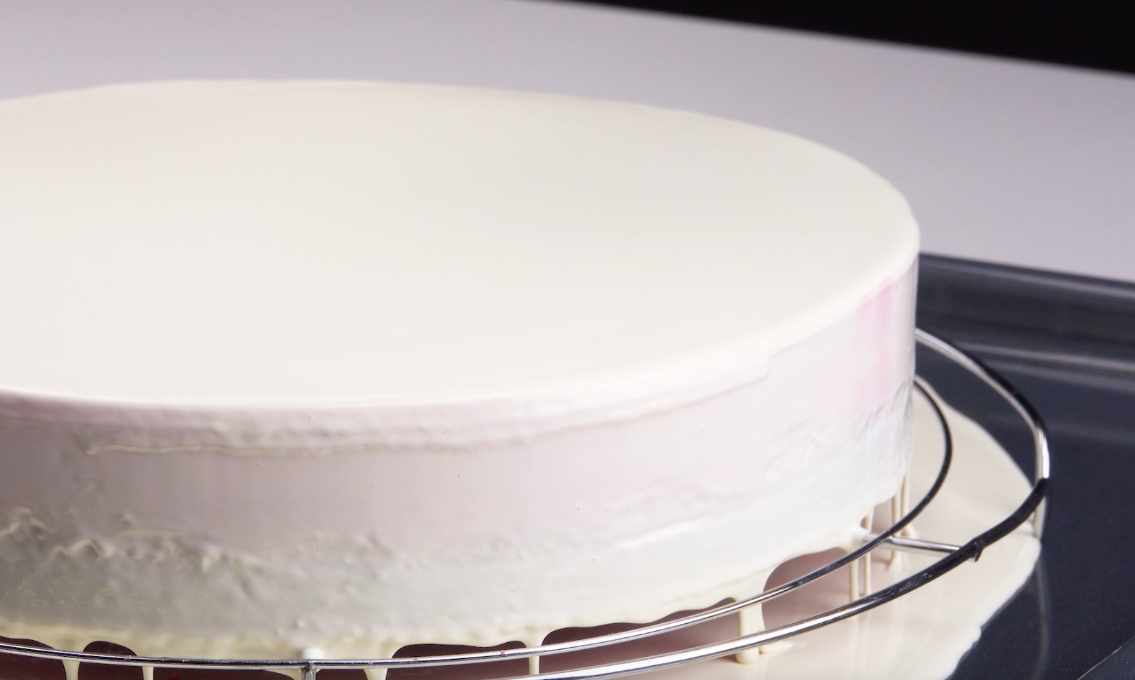 Erhitze die Sahne und füge die Kuvertüre zu. Rühre sie mit einem Schneebesen unter, bis sie sich vollständig gelöst hat. Dann wird es Zeit, weiße Lebensmittelfarbe unterzurühren. Die flüssige Glasur lässt du vollständig auf die Mitte des Kuchens laufen. Dabei läuft sie selbstständig auch am Rand hinunter und hüllt den Kuchen ohne Aufwand vollständig ein.
