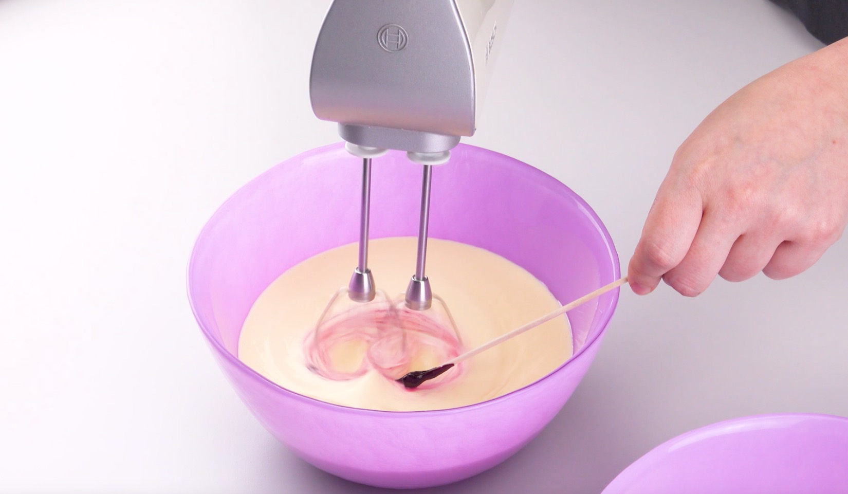Teile die Creme in zwei Hälften und mische unter eine der beiden etwas rosa Lebensmittelfarbe. Vorerst stellst du die beiden Cremeportionen beiseite.