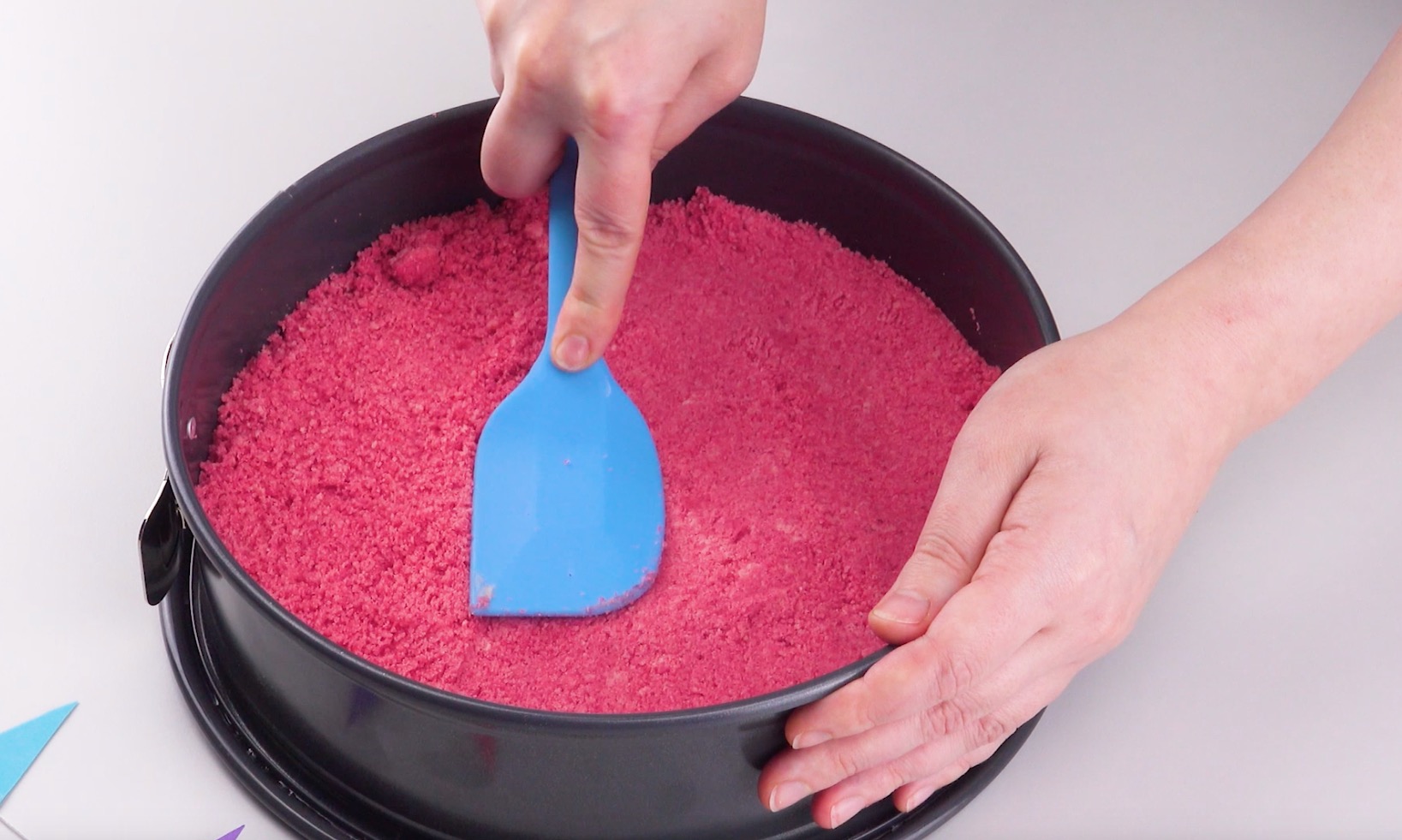 Für den Kuchenboden mische Mehl, Butter, Zucker und wieder etwas rosa Lebensmittelfarbe. Der Teig wird sehr krümelig und trocken. Streue ihn auf den Boden einer mit Backpapier ausgelegten Springform (Durchmesser: 26 cm) und presse ihn mit einem Teigschaber oder der Rückseite eines Esslöffels fest. Dann wird die Springform zwei Stunden kalt gestellt.