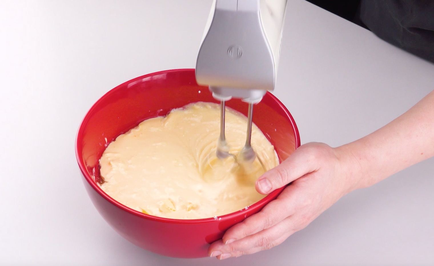 Um die Käsecreme zuzubereiten, gib sämtliche Zutaten in eine große Schüssel und mische sie mit einem Handrührgerät zu einer einheitlichen Masse.