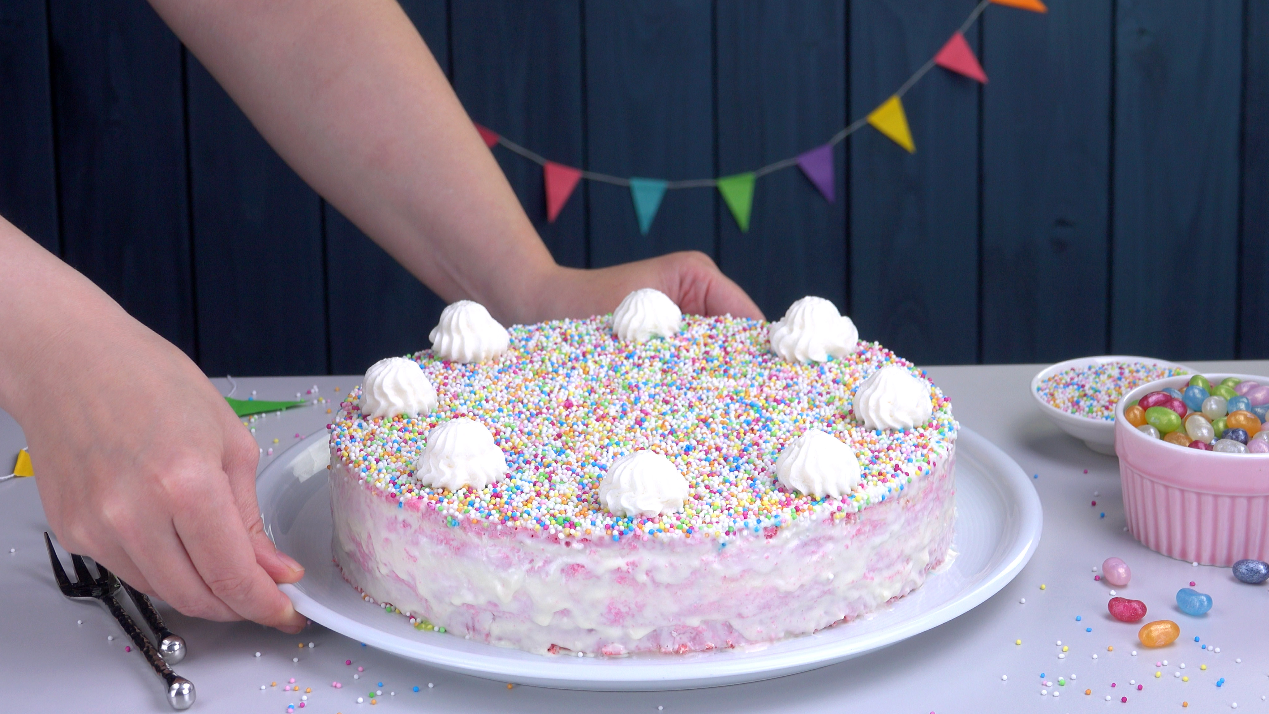 Für den „finalen Look“ bestreust du die gesamte Kuchenoberseite mit bunten Zuckerstreuseln und setzt schließlich kreisförmig Sahnetupfen mit einem Spritzbeutel auf.