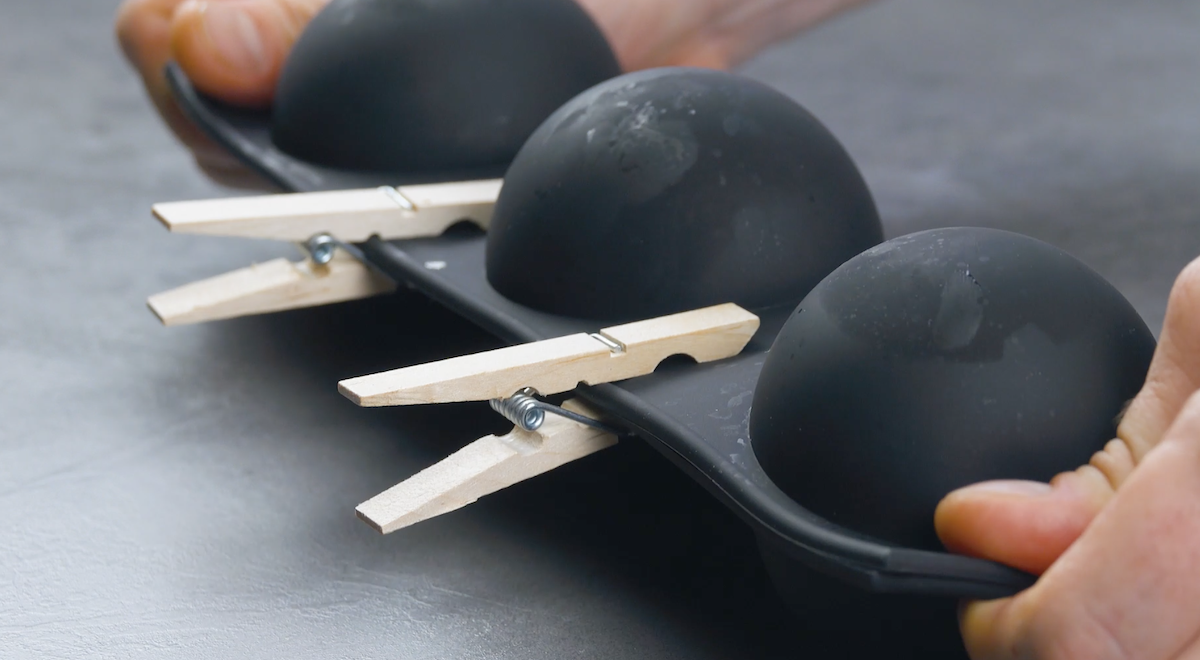 6. Klappe die Silikonform zu, fixiere sie mit Wäscheklammern und friere sie für eine Stunde ein.