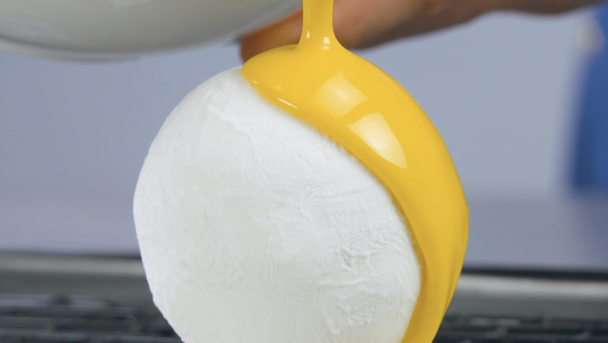 3. Gib Butter, Eigelb, Stärke, Zucker, Zitronensaft (60 ml) in einen Topf und erwärme alles, bis eine dicke Creme entstanden ist. Gib das Lemon Curd nochmals durch ein Sieb. Verteile es dann in drei Mulden der Halbkugelform (Durchmesser: 3,5 cm).