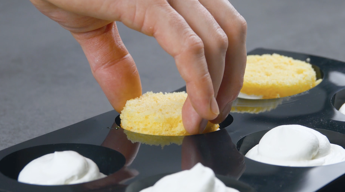 5. Fülle die Zitronenmousse zur Hälfte in die Mulden der Halbkugelform aus Silikon (Durchmesser: 6 cm). Verteile dann das gefrorene Zitronengelee in drei Halbkugeln der Form. In die anderen drei Halbkugeln kommt das gefrorene Lemon Curd. Gib abermals einen Tupfen Zitronenmousse in die Mulden und dann auf drei Halbkugeln jeweils einen ausgestochenen Kreis aus Biskuitteig.