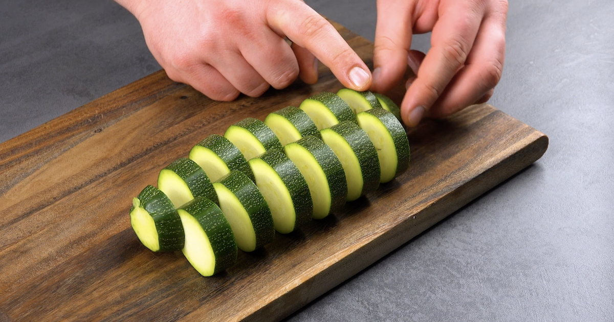 1.) Entferne die beiden Enden der Zucchini und schneide die verbleibende Frucht dann in 14 gleich große Segmente. Verschiebe dann jedes zweite Segment so, dass die einzelnen Scheiben sich nur noch leicht berühren.