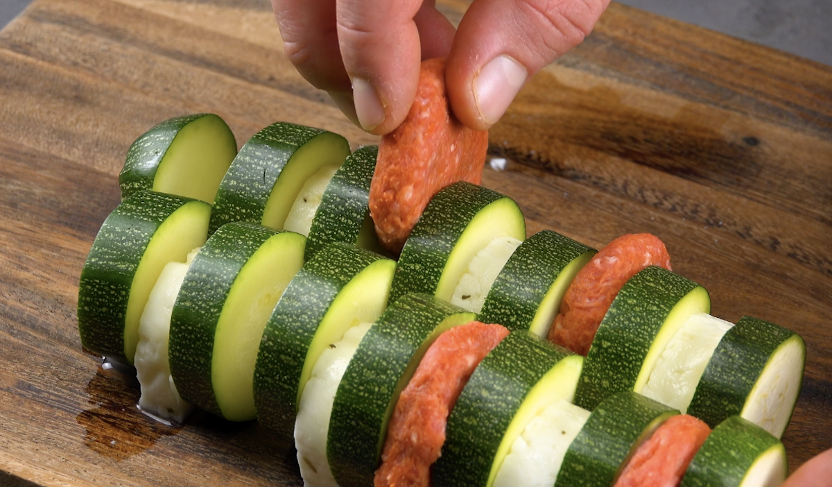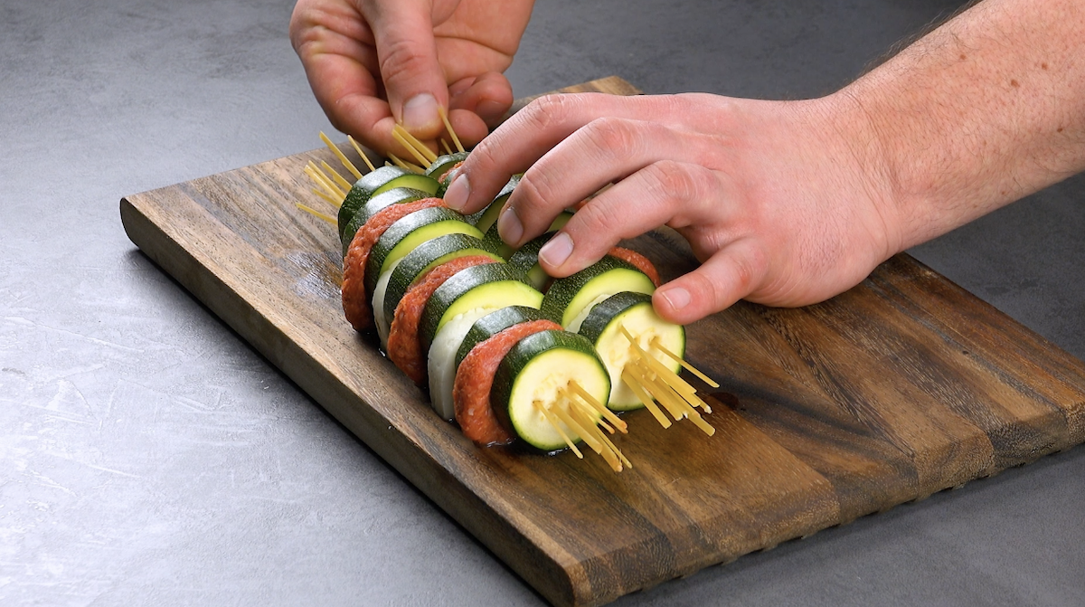 4.) Schiebe nun etwa zehn ungekochte Nudeln durch die Zucchini (plus Halloumi und Hackfleisch), sodass sie auf der anderen Seite wieder herauskommen.