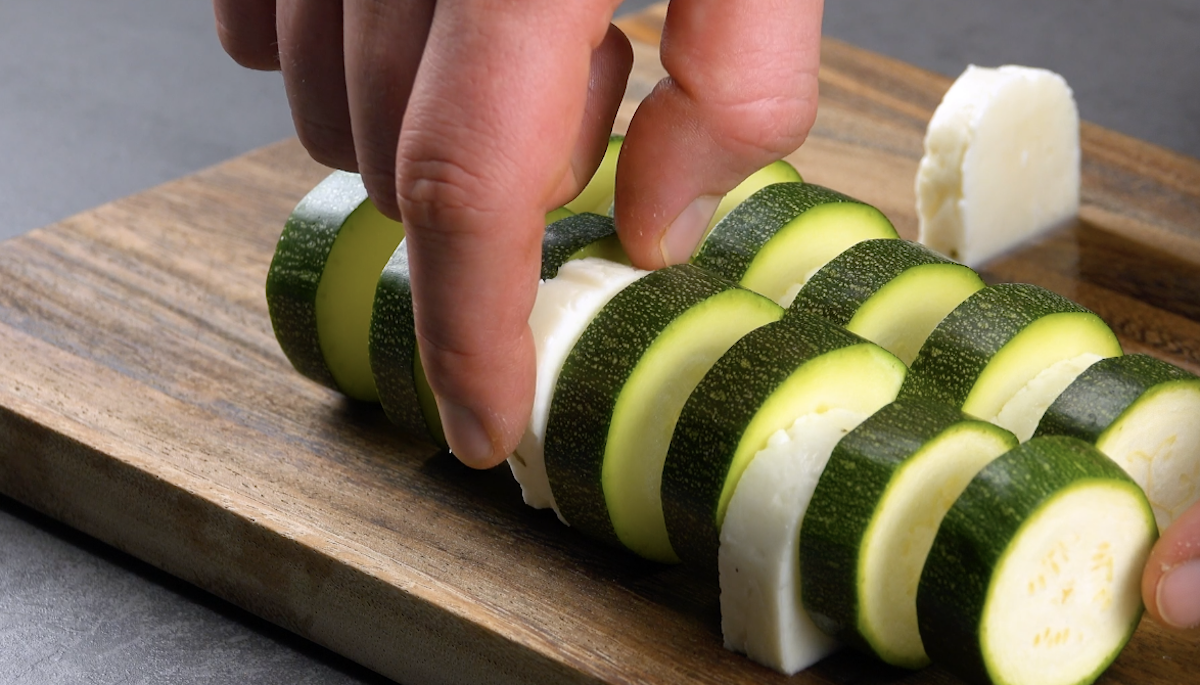 2.) Schneide den Halloumi in 6 Stücke und fülle mit diesen jede zweite Lücke der Zucchini (auf jeder Seite 3 Stück).