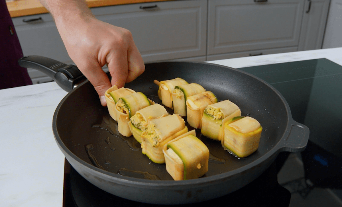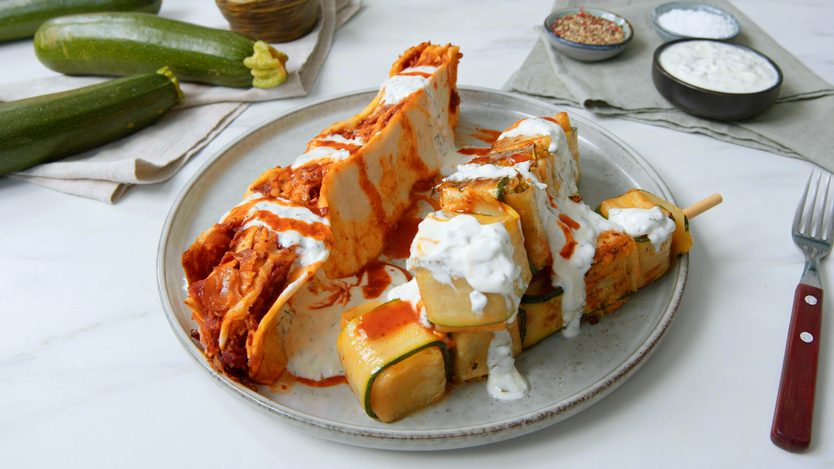 So hast du Zucchini-Spieße bislang bestimmt weder gesehen noch gegessen. Wir formen mithilfe einer Eiswürfelform kleine Zucchini-Pappardelle-Würfel, gefüllt mit Halloumi und Hummus. Dazu servieren wir saftige Käse-Pastrami-Tortillas. Die Zutaten sorgen auf deiner Zunge für eine wahre Geschmacksexplosion.