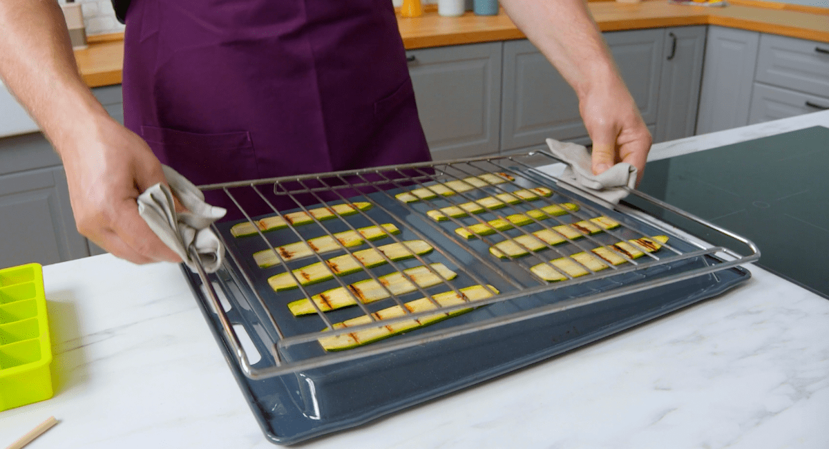 2. Schneide beide Zucchini, z.B. mit einem Gemüsehobel, in ca. 0,5 cm dicke Scheiben. Salze die Scheiben, lass sie 5 Minuten ziehen und lege sie dann auf ein umgedrehtes Backblech. Schiebe ein Ofengitter auf die oberste Schiene in den Ofen und schalte das Gerät auf maximale Temperatur (Grillfunktion). Erhitze das Gitter für ca. 25-30 Minuten und drücke es danach auf die Zucchinischeiben, damit diese den klassischen „Grill-Look“ bekommen.
