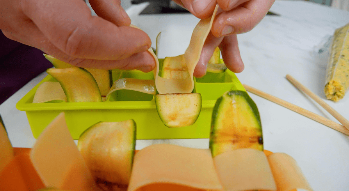 3. Lege immer eine Zucchinischeibe und anschließend quer darauf jeweils eine gekochte Pappardelle in jede zweite Kuhle der Eiswürfelform. Am Ende sollten 10 Kuhlen auf diese Weise belegt sein.
